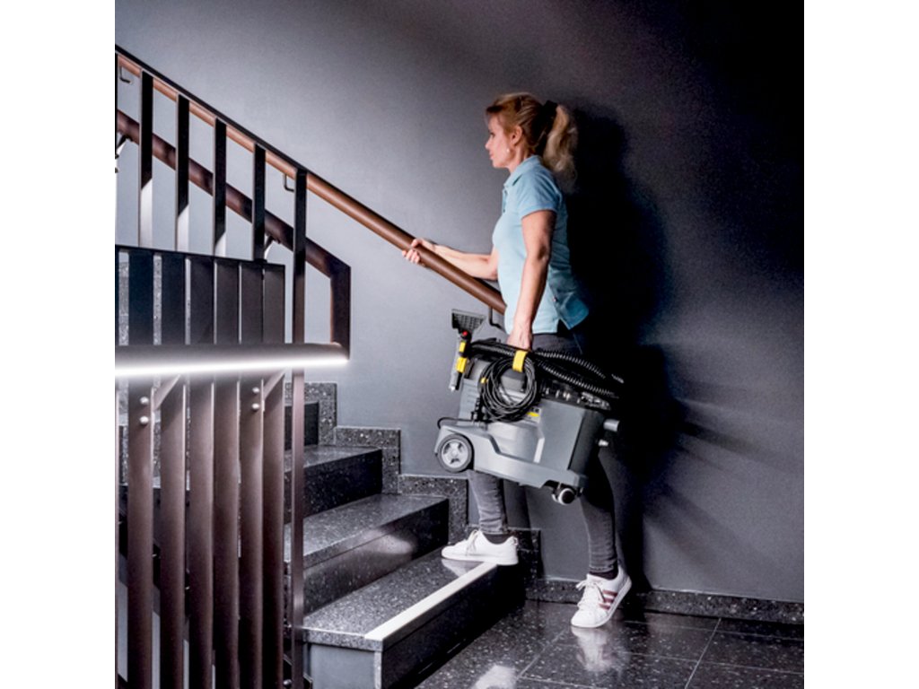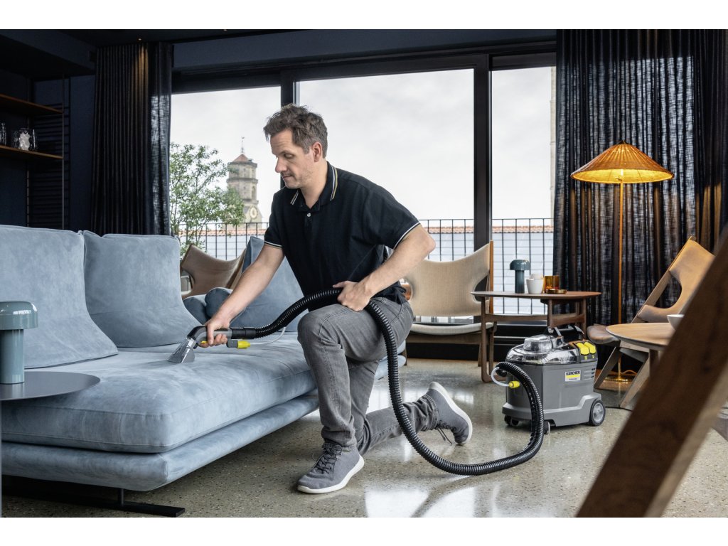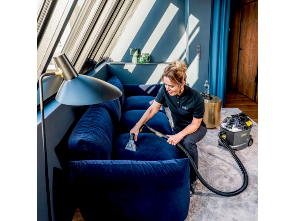 Kompaktní sprejový extrakční stroj nastříká čisticí roztok hluboko do textilních vláken a poté jej opět odstraní s uvolněnými nečistotami. Tento vynikající výkon zpětného sání také zajišťuje rychlé schnutí a znamená, že textilní povrchy lze rychle znovu použít – ideální pro vysoké nároky profesionálů v oblasti úklidu v hotelovém a pohostinském sektoru nebo při čištění interiérů vozidel. Lze použít i standardní extra krátkou hubici na čalounění pro pohodlné a ergonomické čištění úzkých prostor.