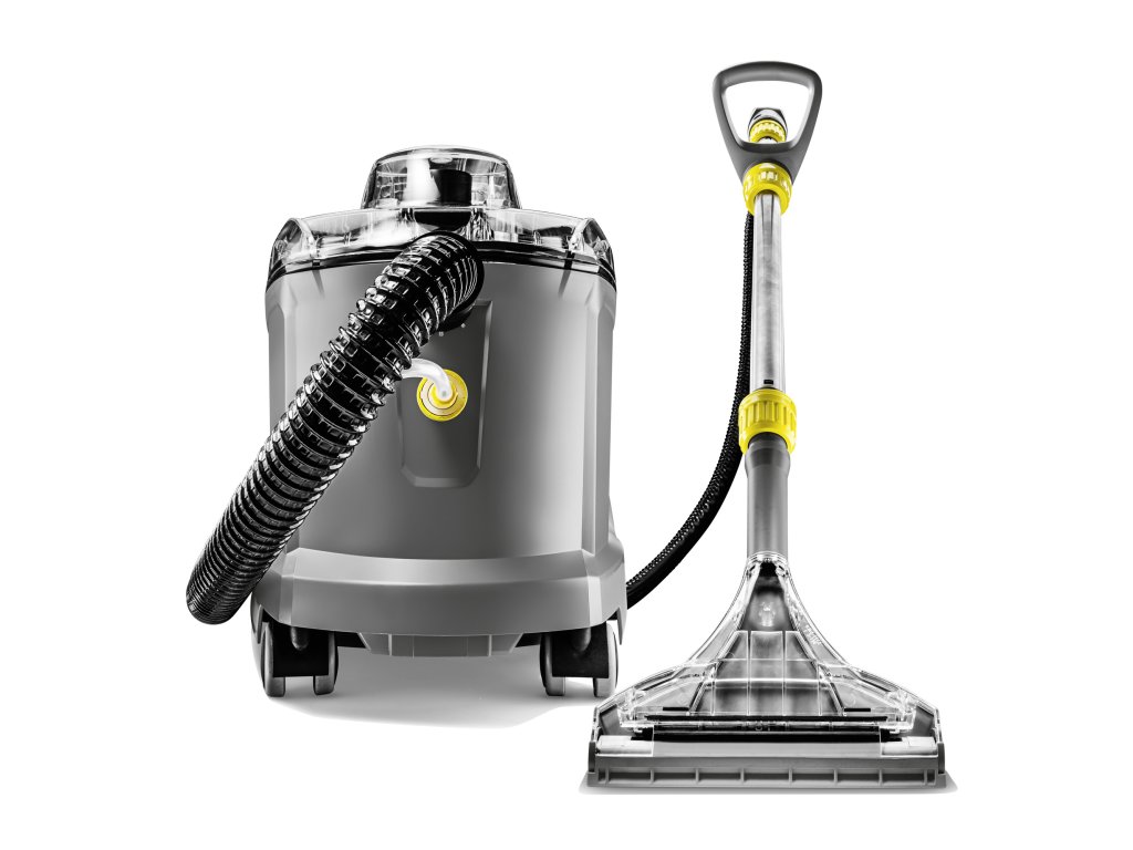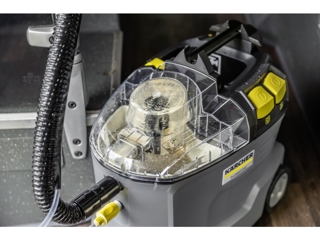 Profesionální sprejový extrakční čistič Puzzi 8/1 ADV s 240 mm podlahovou hubicí a krátkou hubicí na čalounění je ideální pro rychlé a důkladné čištění čalounění i kobercových ploch.