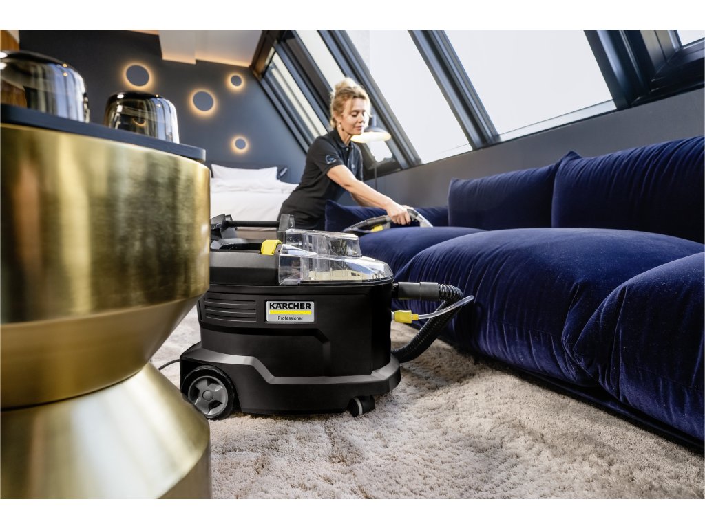 Profesionální čistič čalounění a textilu – v elegantní černé barvě k 90. výročí Kärcher. Součástí balení čisticí tablety RM 760 (16 ks) jako dárek. Sprejový extraktor Puzzi 8/1 v limitované černé edici je spolehlivý a výkonný pomocník na čištění čalounění, koberců a všech textilních povrchů. Díky silnému sání a hloubkovému nástřiku čisticího roztoku dosahuje skvělých výsledků – a to s minimálním zbytkovým vlhkem, takže povrchy rychle schnou a jsou brzy znovu použitelné.