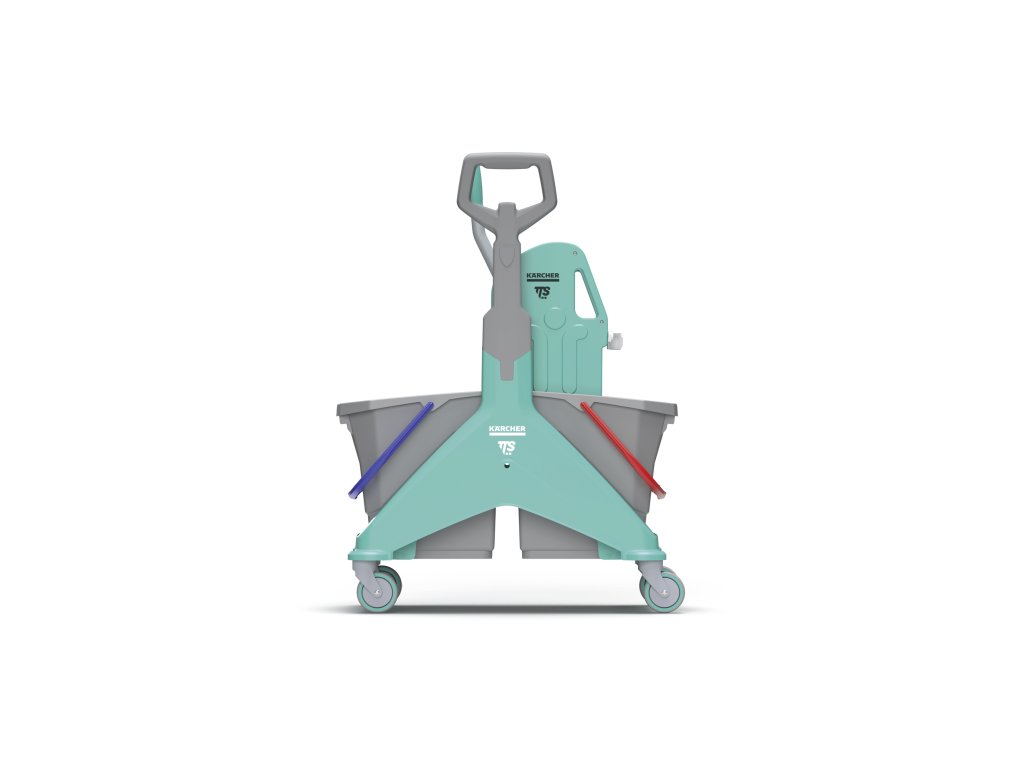 Úklidový vozík Nickita Tec od značky TTS/Kärcher s plastovou rukojetí, barevným rámem a ždímačem Tec, vybavený dvěma kbelíky o objemu 2 x 25 L s modrou a červenou rukojetí a kolečky o průměru 80 mm s ochrannými nárazníky.