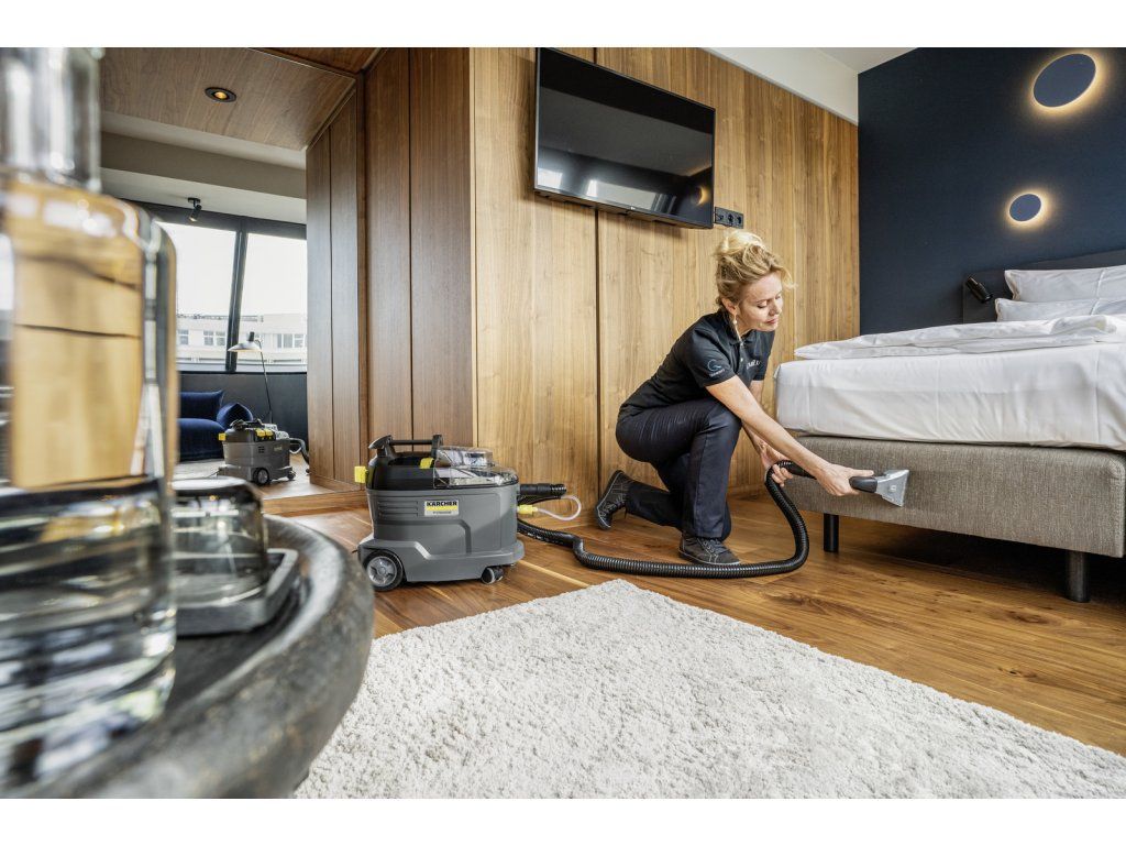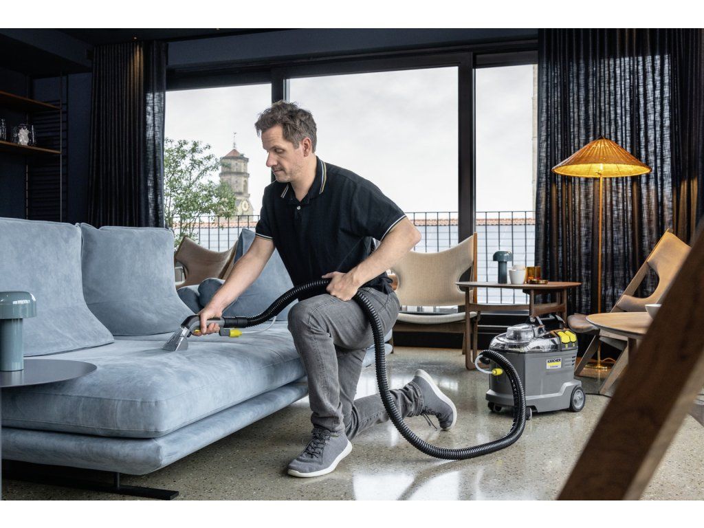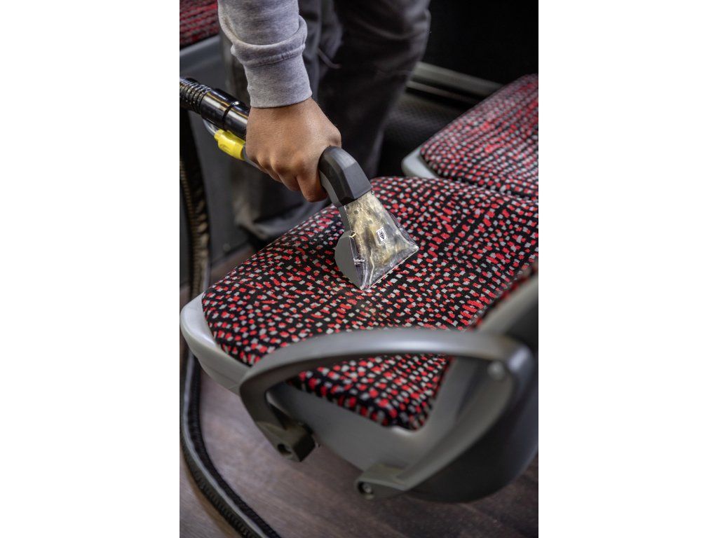 Kompaktní sprejový extrakční stroj nastříká čisticí roztok hluboko do textilních vláken a poté jej opět odstraní s uvolněnými nečistotami. Tento vynikající výkon zpětného sání také zajišťuje rychlé schnutí a znamená, že textilní povrchy lze rychle znovu použít – ideální pro vysoké nároky profesionálů v oblasti úklidu v hotelovém a pohostinském sektoru nebo při čištění interiérů vozidel, koberců. Lze použít i standardní extra krátkou hubici na čalounění pro pohodlné a ergonomické čištění úzkých prostor.