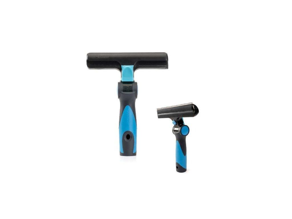 Praktická škrabka na okna o šířce 15 cm s tyrkysovým protiskluzovým držákem pro pohodlný a bezpečný úchop. Stačí posunout tlačítko a čepel se bezpečně skryje, když ji zrovna nepoužíváte.