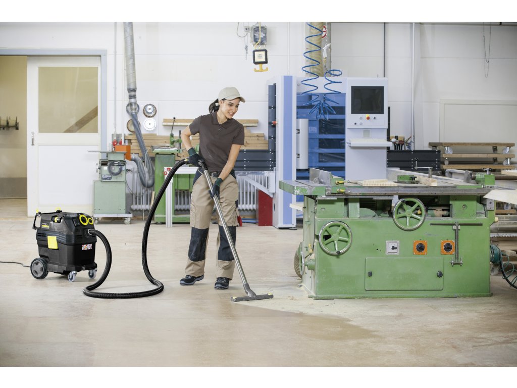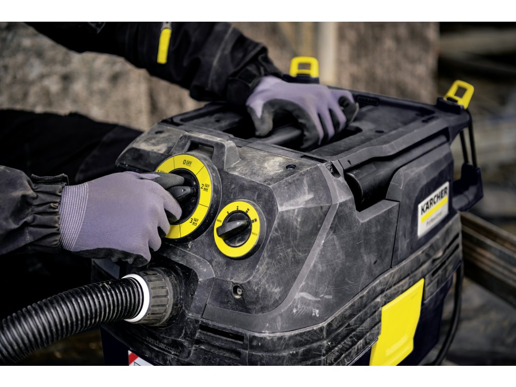 Robustní 30litrová nádoba je odolná proti nárazům, vybavená kovovými kolečky a nárazníkem. Zásuvka s automatickým zapínáním/vypínáním umožňuje pohodlné připojení elektrického nářadí – vysavač se spustí i vypne současně s nářadím.
