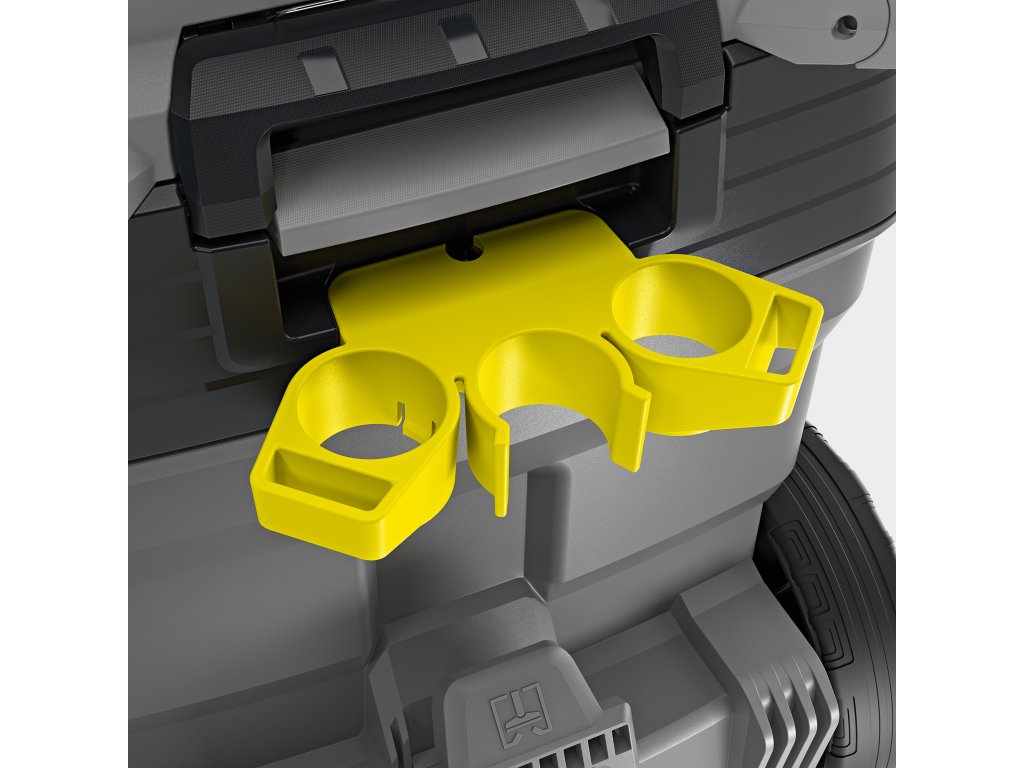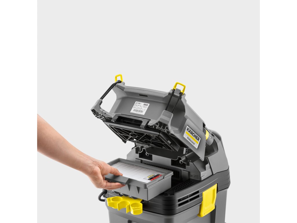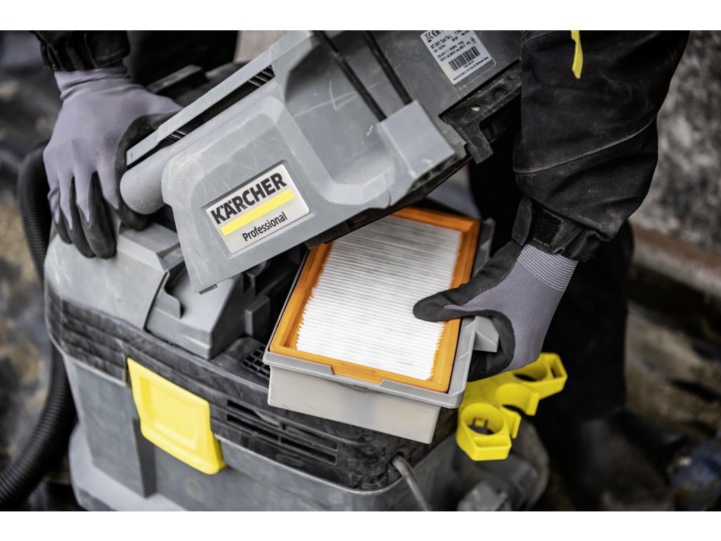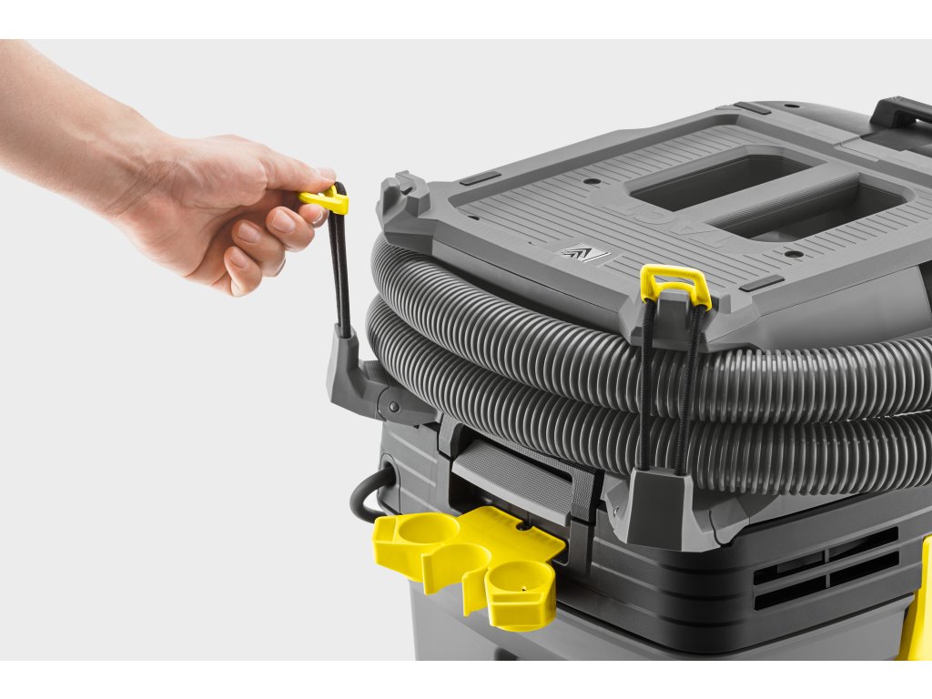 Součástí výbavy je zásuvka se spínací automatikou, ideální pro připojení elektrického nářadí. Praktický plochý PES filtr s PTFE povrchem umožňuje bezprašný provoz a snadnou výměnu díky vyjímatelnému krytu. S robustní 30l nádobou, čtyřmi odolnými kolečky a kabelem o délce 7,5 m pohodlně uklidíte více místností najednou.
