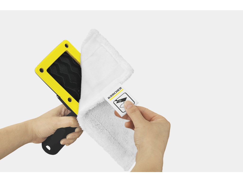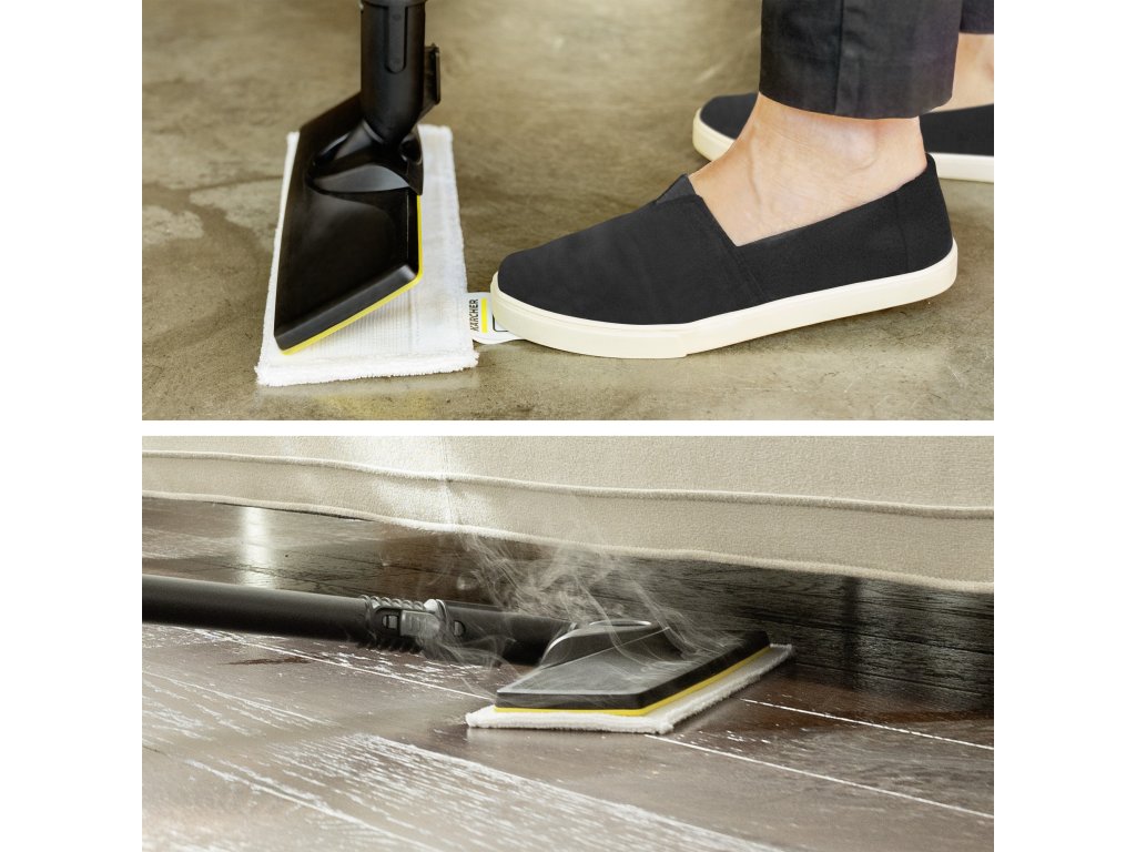 Díky podlahové hubici EasyFix s flexibilním kloubem a lamelovou technologií se pára rovnoměrně rozprostře po celé ploše. Utěrka z mikrovlákna se upevňuje suchým zipem a sundává se pohodlně bez kontaktu se špínou – jednoduše šlápnutím.