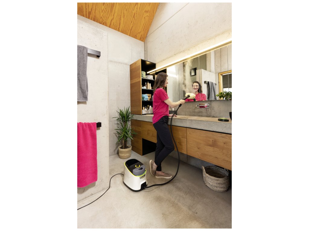 Čistič je připraven k použití již za přibližně 3 minuty a umožňuje nepřerušovanou práci díky odnímatelné nádrži, kterou lze doplňovat i během provozu. S třístupňovou regulací páry snadno přizpůsobíte výkon aktuálním potřebám.
