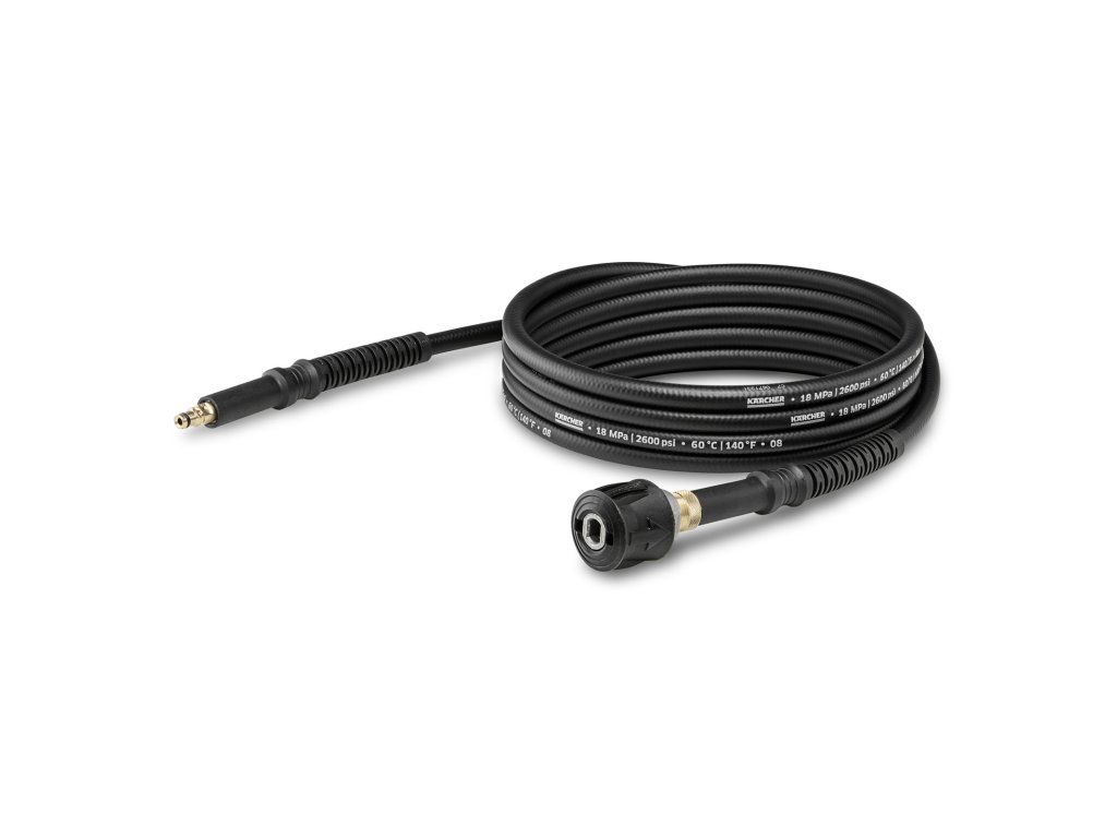 Hadice je vyrobena z robustního materiálu DN-8, zesílena textilním pletivem a vybavena ochranou proti zlomení. Odolá tlaku až 180 barů a teplotě do 60 °C, takže se hodí i pro použití s čisticími prostředky.